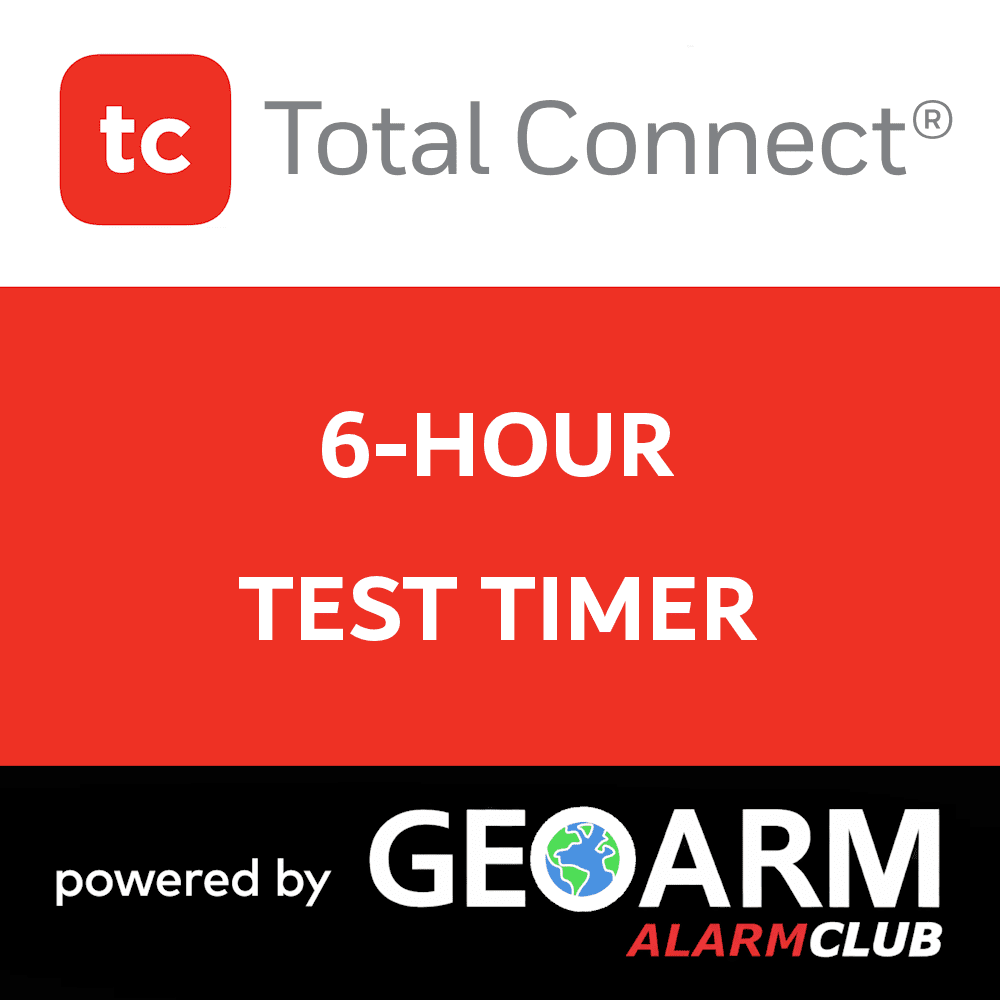 The 6-Hour Test Timer services include 4 check in's/day from the security system control panel, though the Total Connect alarm communicator, back to the GeoArm central station. The hourly test timer ensures that your Total Connect compatible control panel is sending communications to the Central Station and is working properly throughout the day.